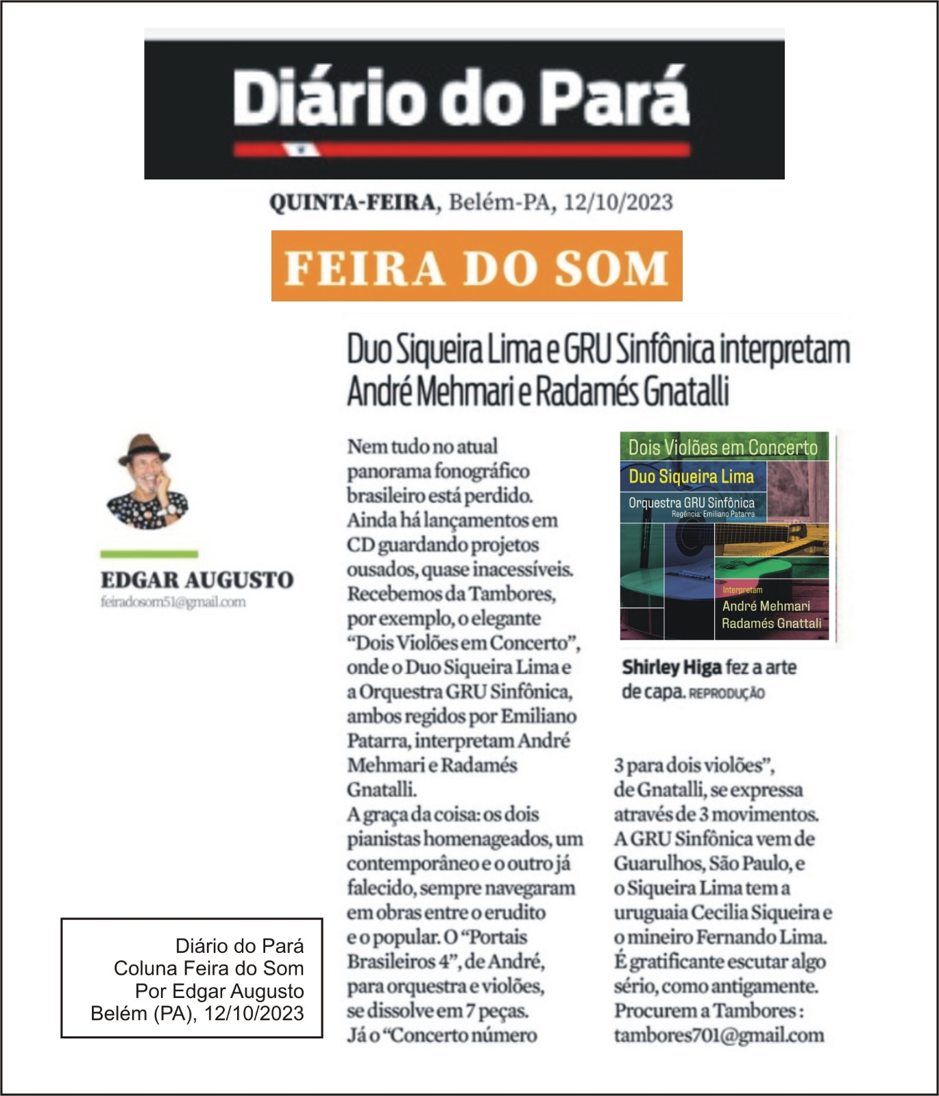 Tudo isso está no CD Dois Violões em Concerto, (distribuição Tratore) que tem regência do maestro Emiliano Patarra e foi gravado no estúdio do próprio Mehmari, em São Paulo. É projeto aprovado pelo ProAc 2022 e tem produção da Roda Produções Artísticas.